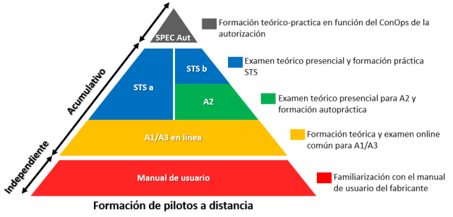 Antes de subir al Nivel 2, necesitas estar registrado como OPERADOR UAS y tener superado el NIVEL 1 mediante examen ONLINE A1 / A3 disponible en la web de AESA ya que son NIVELES ACUMULATIVOS como puedes comprobar en la pirámide de aprendizaje.